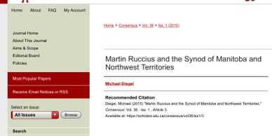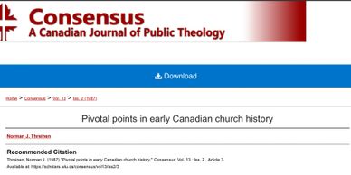 Norman J. Threinen, “ Pivotal Points in Early Canadian Church History, Consensus 13 No. 2 (1987), Article 3. A reflection upon three pivotal points in Canadian history; this establishment of the first Lutheran church in Canada in Halifax; confederation and the discussion of the formation of an indigenous Lutheran church in Canada; and the implications and challenges for the Lutheran Church during and after WW2 (especially for the German Lutherans in Canada). GJ