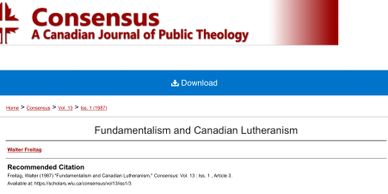 Walter Freitag, "Fundamentalism and Canadian Lutheranism," Consensus, 13 No. 1 (1987), Article 3. One of the “elephants in the room” with regard to a possible three-way merger of the Lutheran churches in Canada was the influence fundamentalism had on Lutherans, especially with regard to question of inerrancy of Scripture. Freitag explores the often not acknowledged relationship between fundamentalism and Lutheran pietism in the Canadian context.. GJ