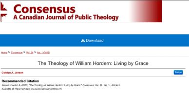 Gordon A. Jensen. “The Theology of William Hordern: Living by Grace.” Consensus, 36 No. 1 (2015), Article 6. This article provides an overview of a pre-eminent Canadian Lutheran theologian, Bill Hordern. The first president of the merged Lutheran Seminaries in Saskatoon, he was also on the merger commission leading to the formation of the ELCIC. His theological approach has shaped many pastors in the ELCIC. GJ